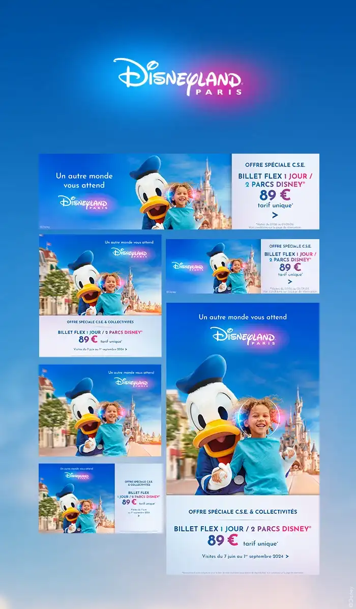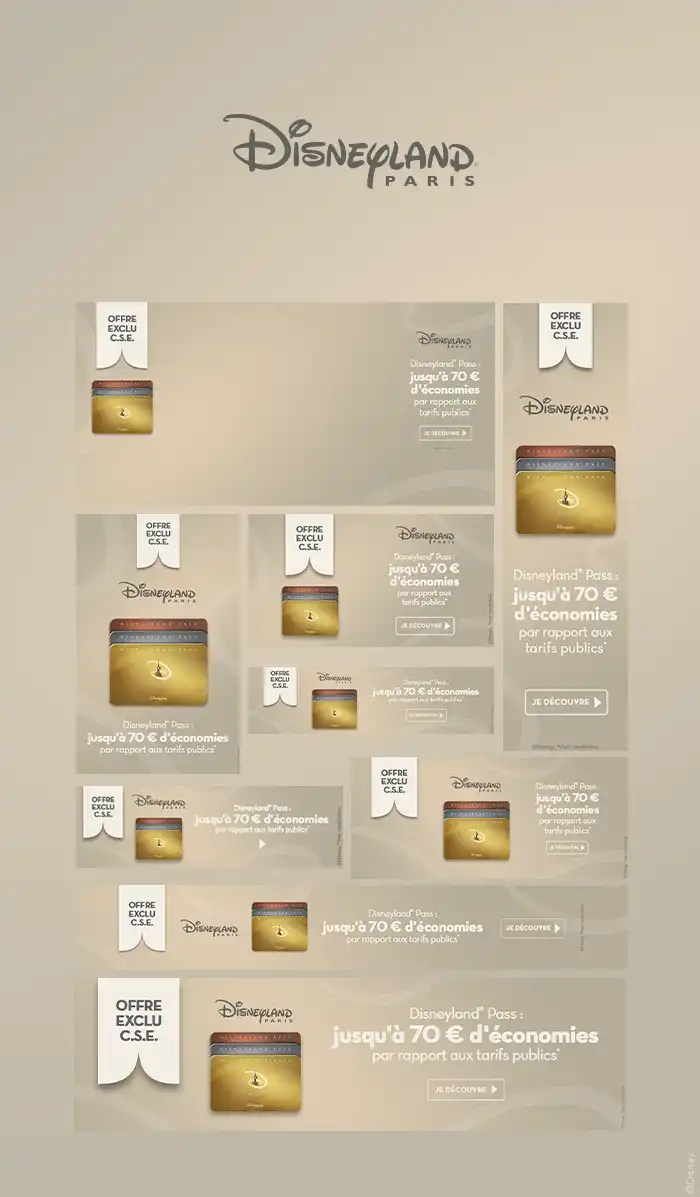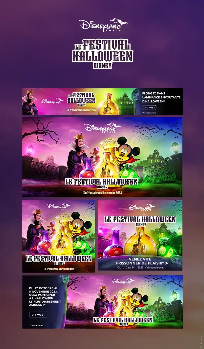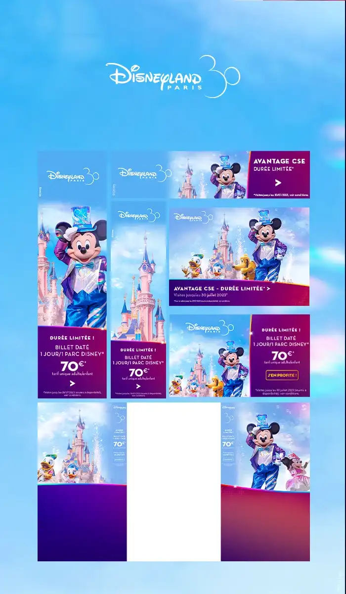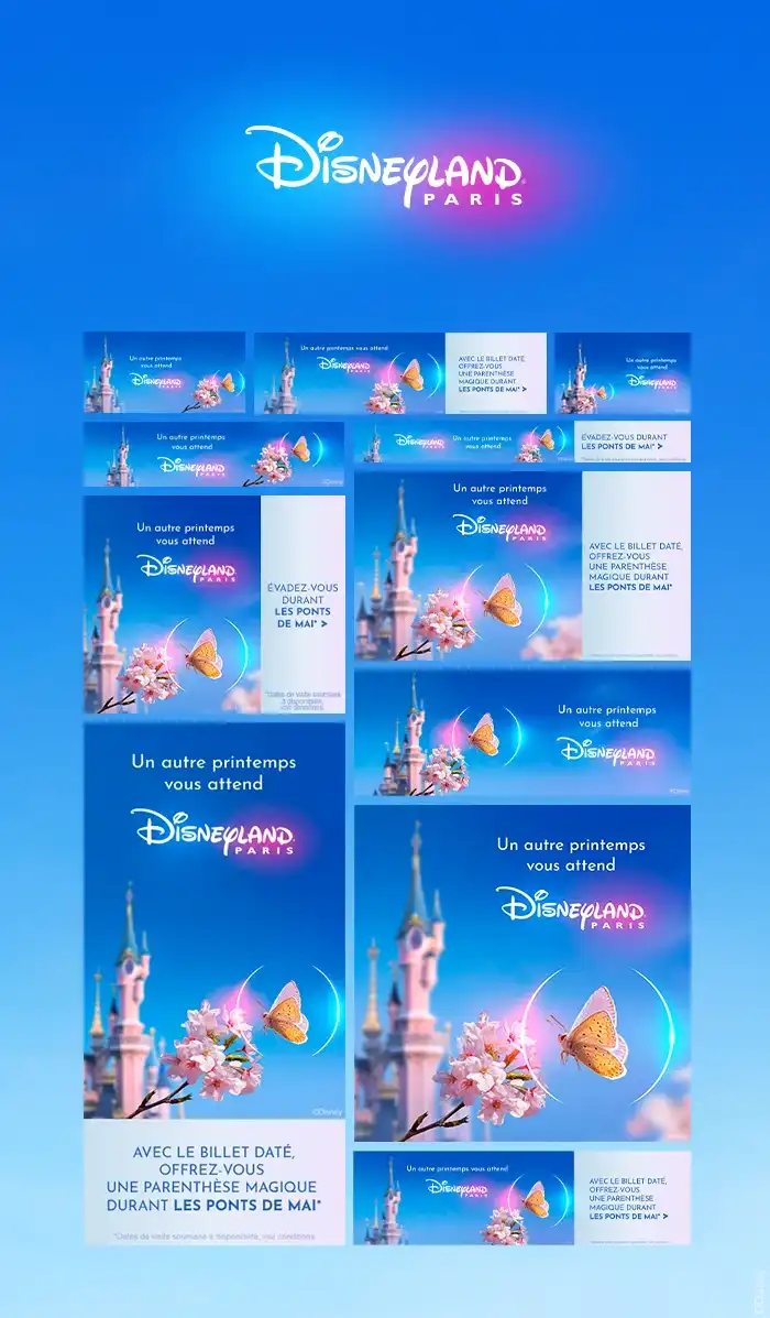 Chez MadMix Digital, j’ai travaillé sur de nombreuses campagnes display pour Disneyland Paris, visant à attirer de futurs visiteurs en mettant en avant les événements, saisons et expériences du parc. Les créations, diffusées sur des sites partenaires (FNAC, Carrefour Voyages, Ticketmaster…), devaient retranscrire l’univers Disney tout en respectant strictement ses chartes graphiques et les contraintes des formats web.02. Mon rôle