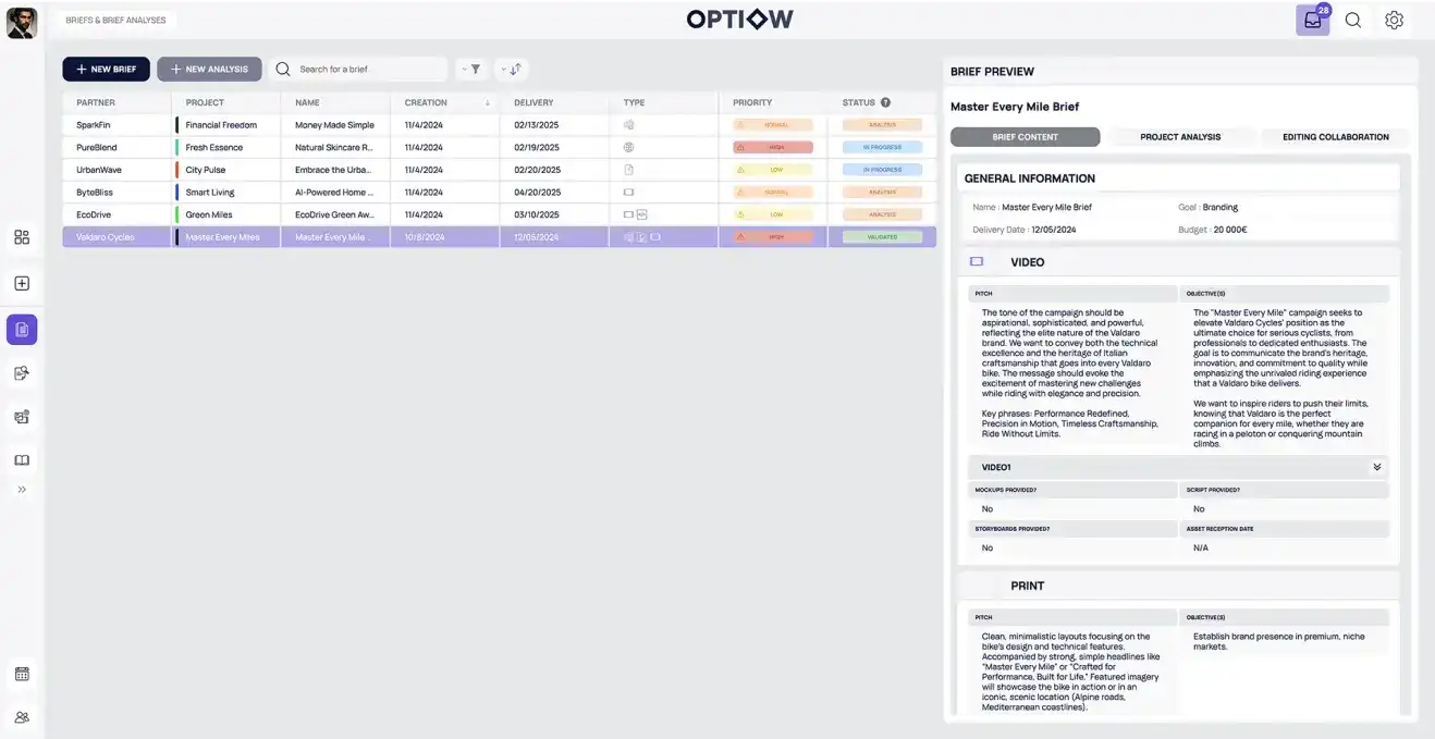 Optiow est une plateforme conçue pour optimiser le pilotage et l’analyse de projets en temps réel. L’enjeu : créer une interface claire, fluide et intuitive, pensée pour les équipes marketing et les agences, au cœur d’un outil à forte dimension fonctionnelle.02. Mon rôle