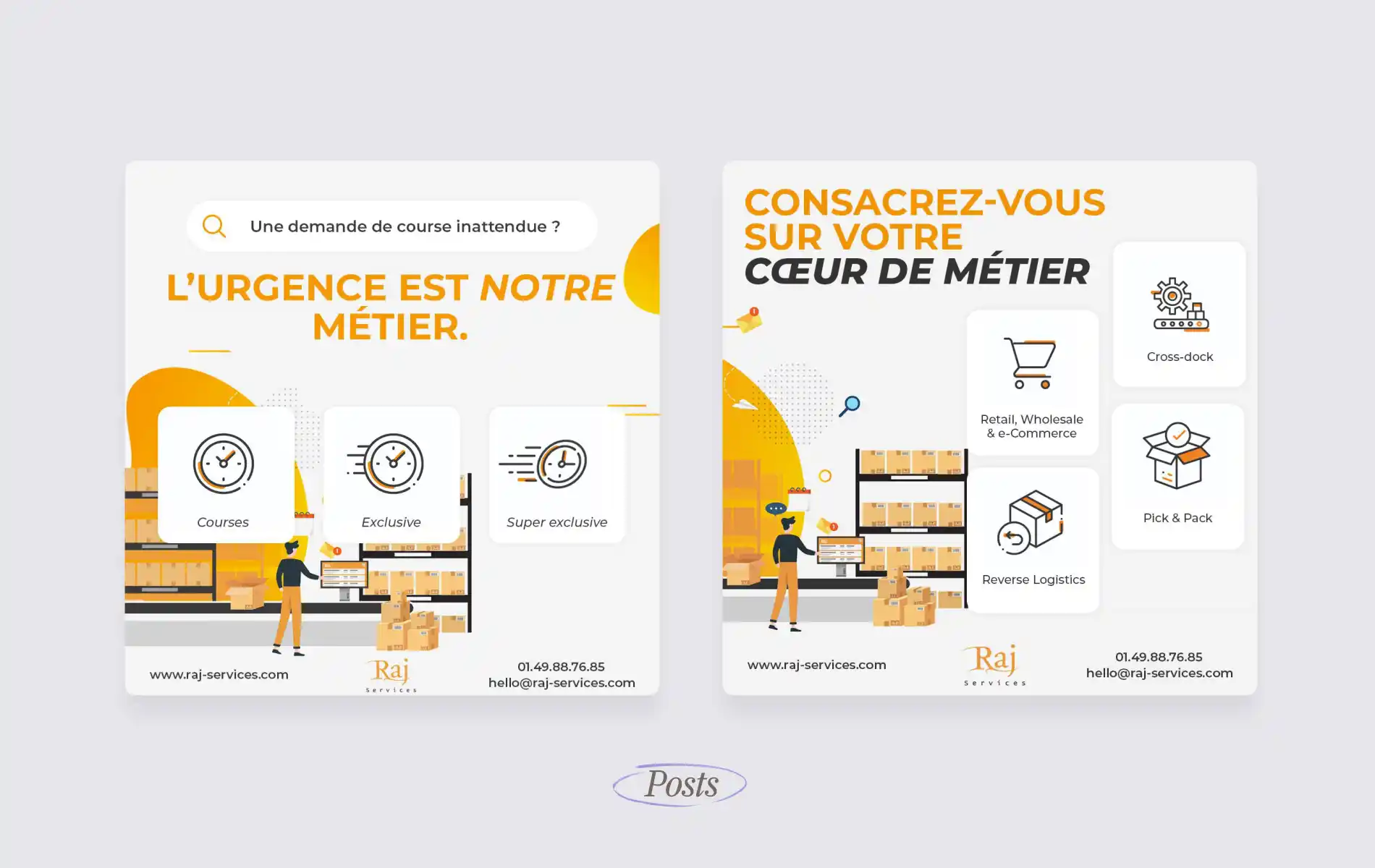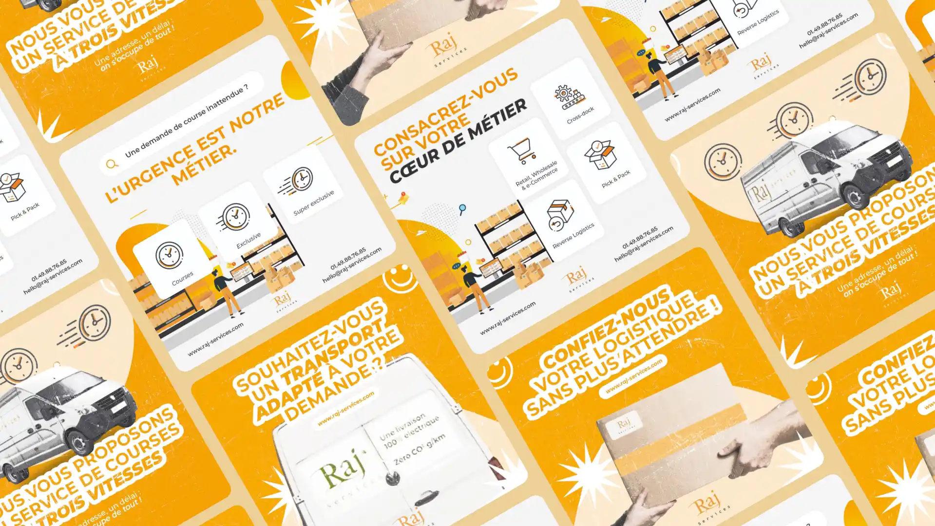 En 2022, RAJ Services, entreprise spécialisée en logistique, a fait appel au studio pour piloter l’ensemble de sa création graphique. L’objectif : structurer et renforcer l’image de marque à travers des supports print, digitaux et social media, tout en gagnant en visibilité et en cohérence visuelle.02. Mon rôle