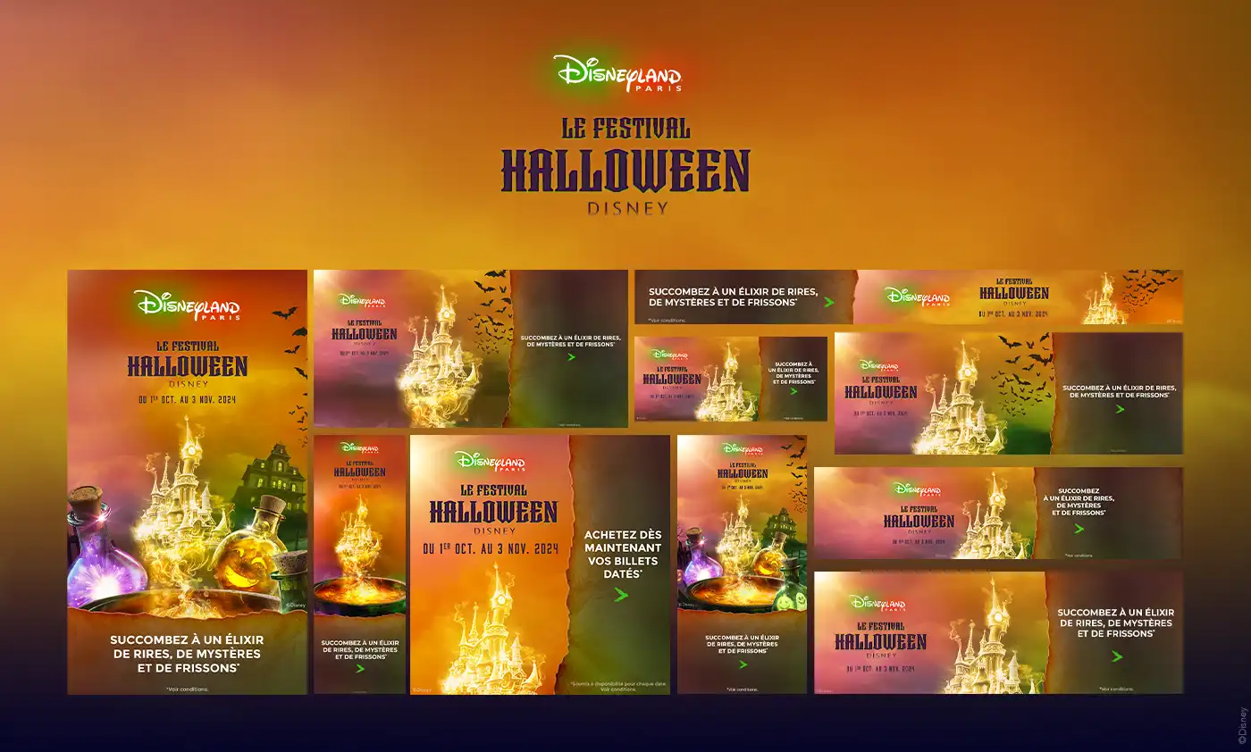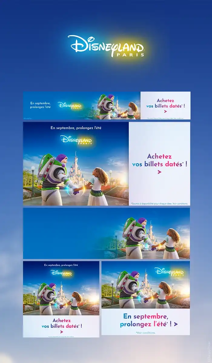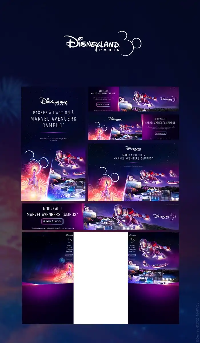 Chez MadMix Digital, j’ai travaillé sur de nombreuses campagnes display pour Disneyland Paris, visant à attirer de futurs visiteurs en mettant en avant les événements, saisons et expériences du parc. Les créations, diffusées sur des sites partenaires (FNAC, Carrefour Voyages, Ticketmaster…), devaient retranscrire l’univers Disney tout en respectant strictement ses chartes graphiques et les contraintes des formats web.02. Mon rôle