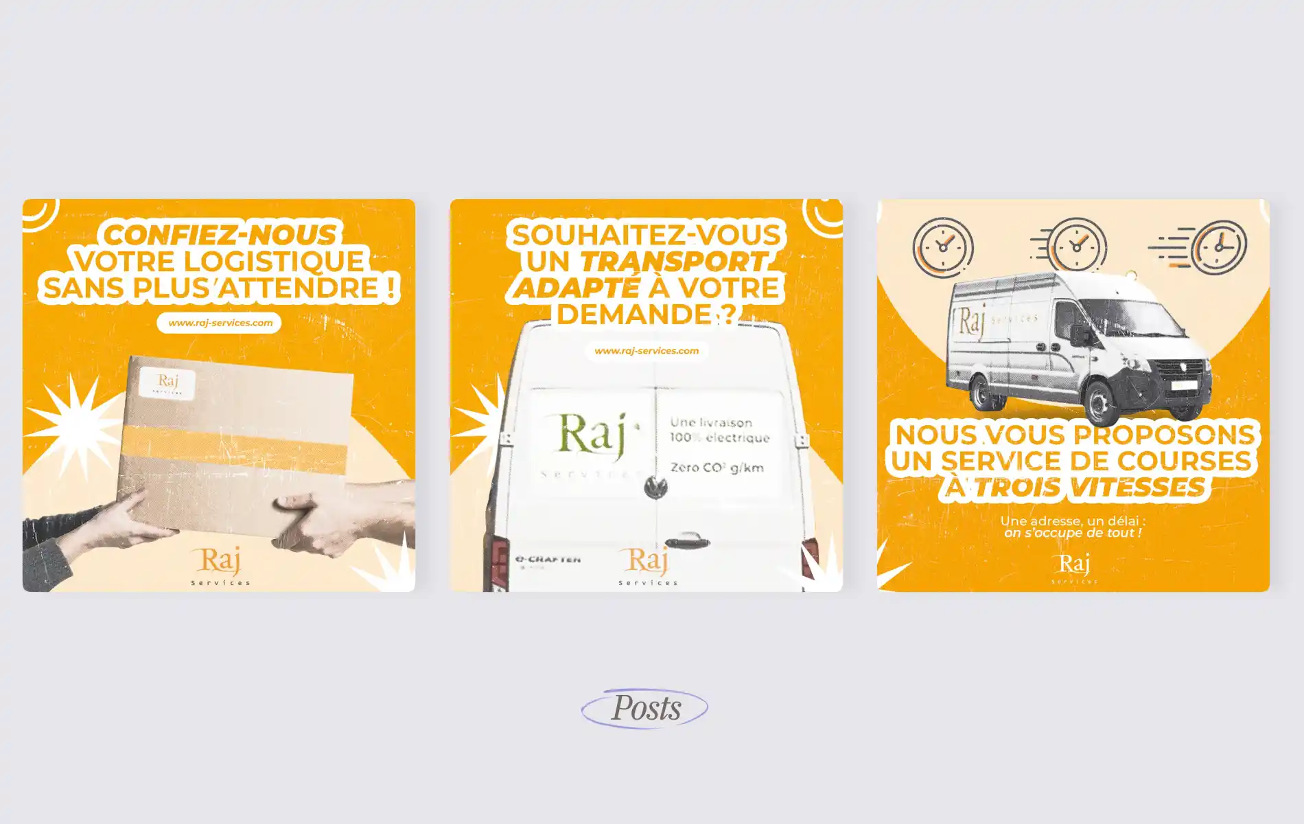 En 2022, RAJ Services, entreprise spécialisée en logistique, a fait appel au studio pour piloter l’ensemble de sa création graphique. L’objectif : structurer et renforcer l’image de marque à travers des supports print, digitaux et social media, tout en gagnant en visibilité et en cohérence visuelle.02. Mon rôle
